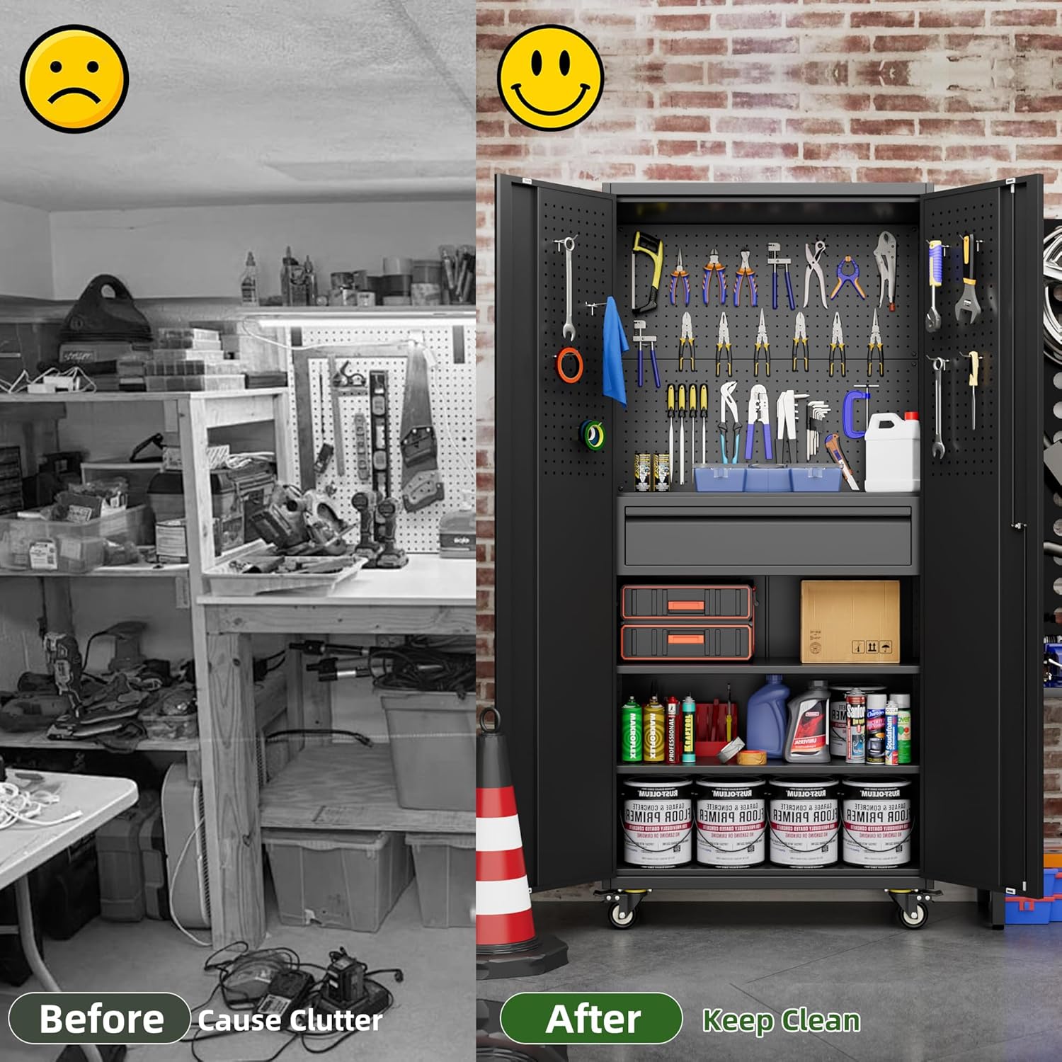 - [Swivel Wheels with Lock] Garage storage cabinet with Wheels has 4 lockable wheels,you can move them around as needed and the casters and wheels work great on all the different surfaces,besides the wheels can be locked and you can fix the cabinet where you want to place.