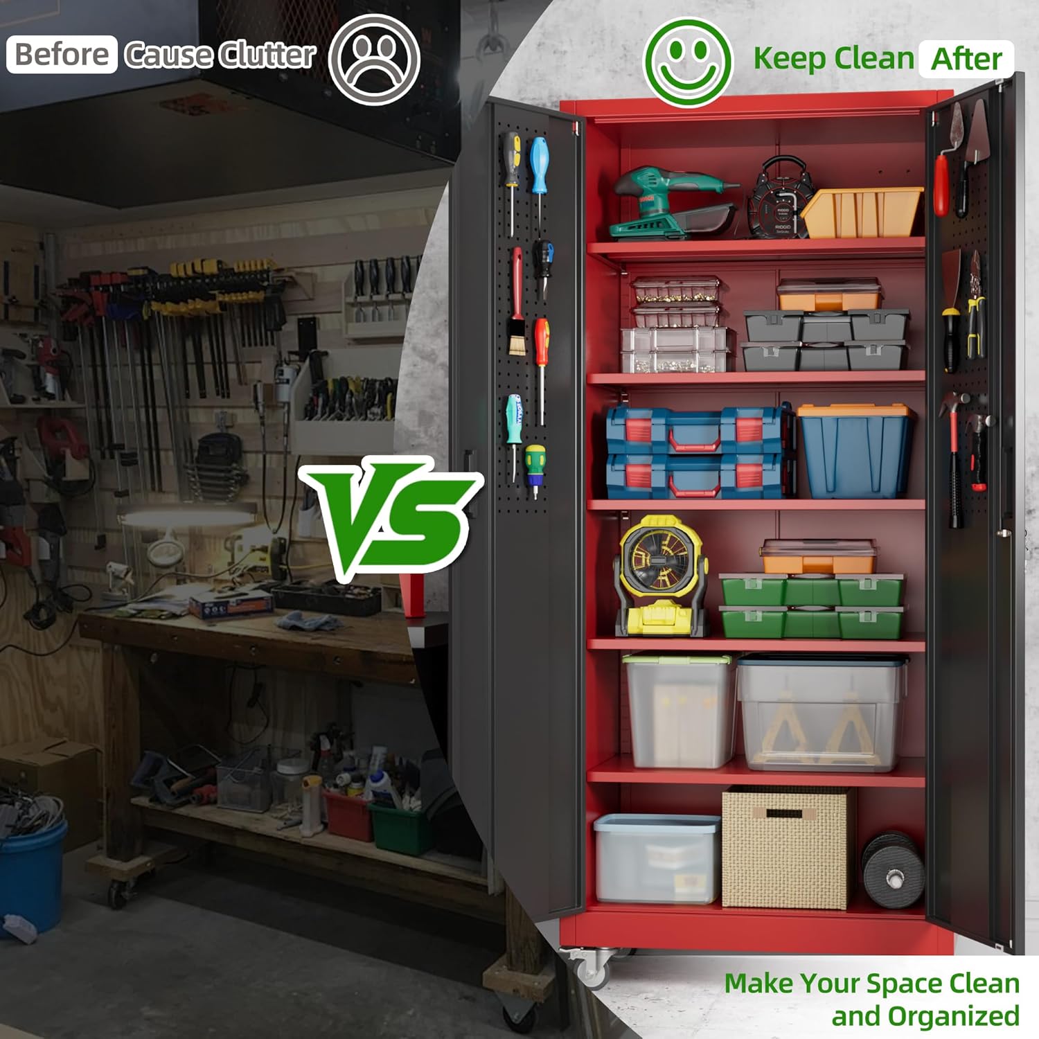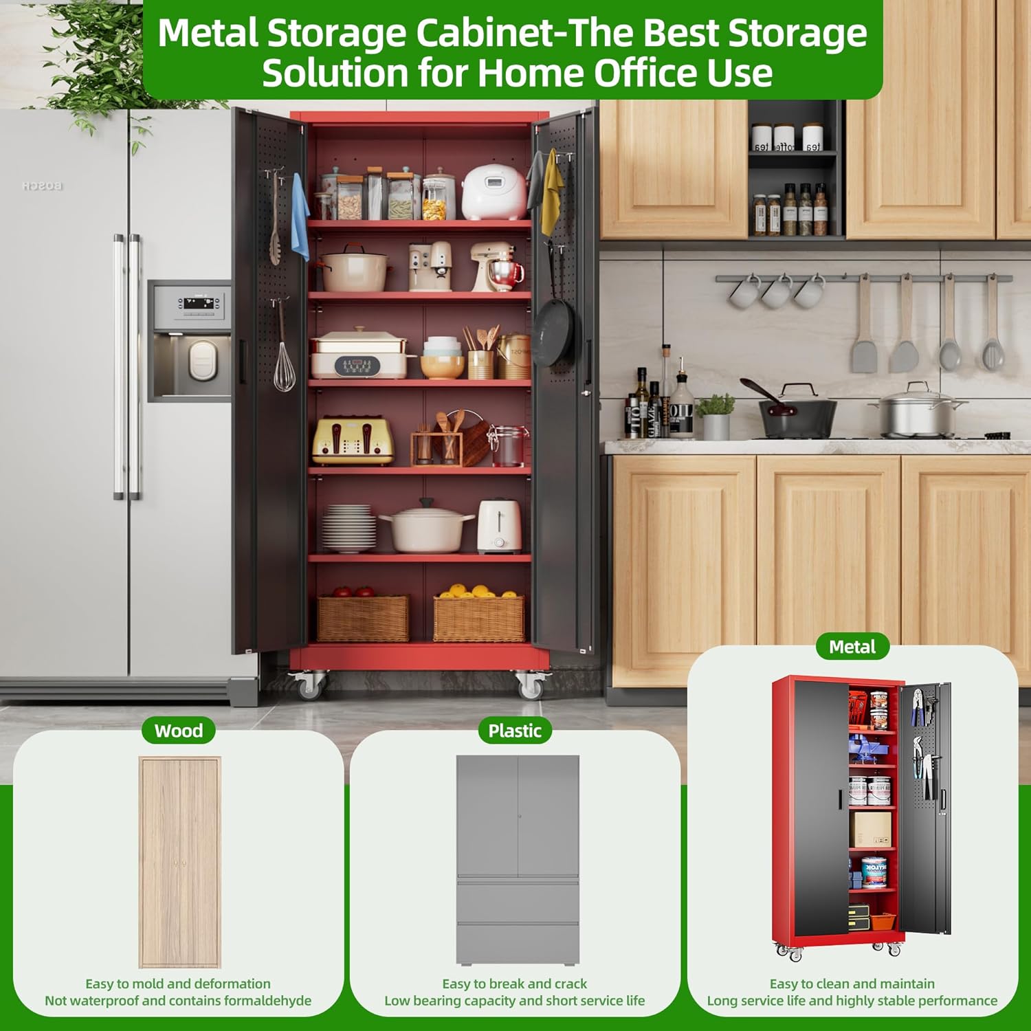 Aobabo Upgraded Garage Storage Cabinets with Wheels,Metal Storage Cabinets with 5 Adjustable Shelves for Garage Home Office Storage, Red-Black,71''H*32''W*16''D,Assembly Required