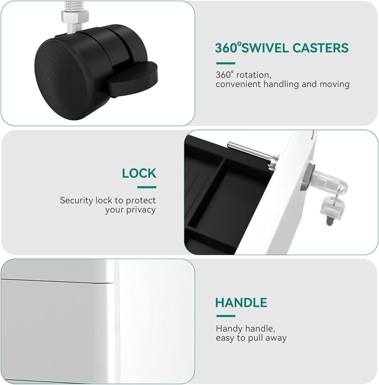 - Free-range Mobility with 5 Casters: This lockable filing cabinet has 4 x swivel casters (two of them are lockable) + 1x anti-tipping central caster; Easy and safe to move! 360ยฐswivel casters provide great multi-directional mobility with little effort