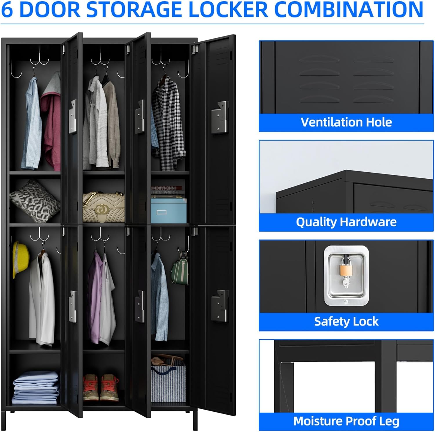 6 Doors Metal Lockers for Employees with Lock, Metal Locker with 18 Hooks for School Garage Office Gym Home,Assembly Required,Black