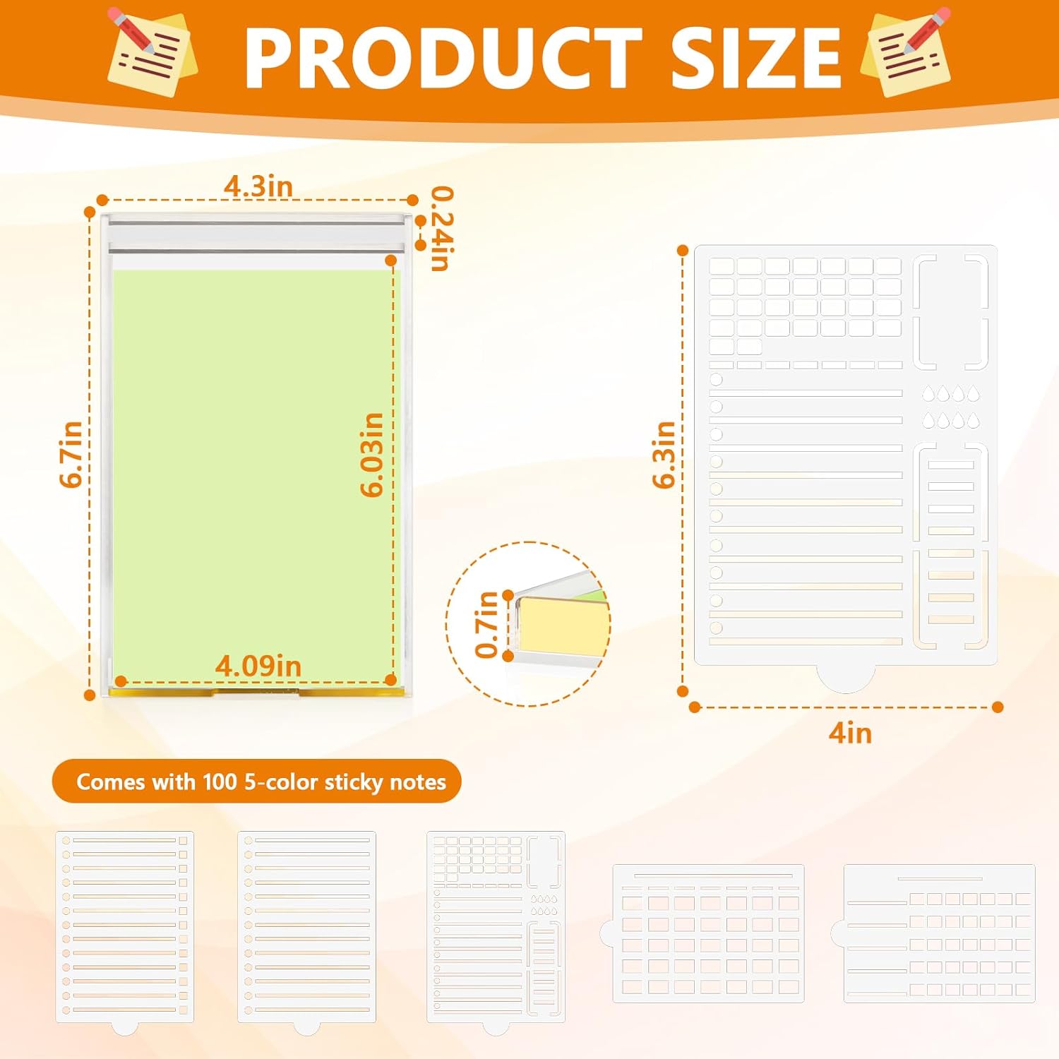 - 【Durable Sticky Notes Stencil Holder, Enough To Meet Daily Needs】Our sticky notes holder and stencil are meticulously crafted from acrylic, making them both durable and stylish. They also double as phone stands. The sticky note holders have outer dimensions of approximately 6.65x4.33x0.71 inches, making them ideal for holding any 4 x 6-inch sticky note.In addition, we also include 100 sticky notes in 5 colors: green, yellow, orange, blue and pink, 20 sheets in each color, enough to meet your daily needs.