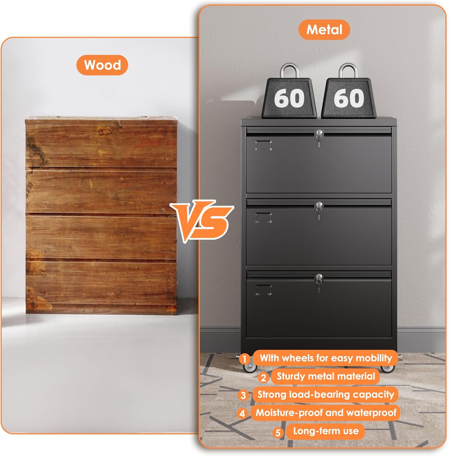 METAN Upgrade 3 Drawers Lateral File Cabinet on Wheels,Steel Office Filing Storage Cabinet with 3 Locks,Assembly Required,Black