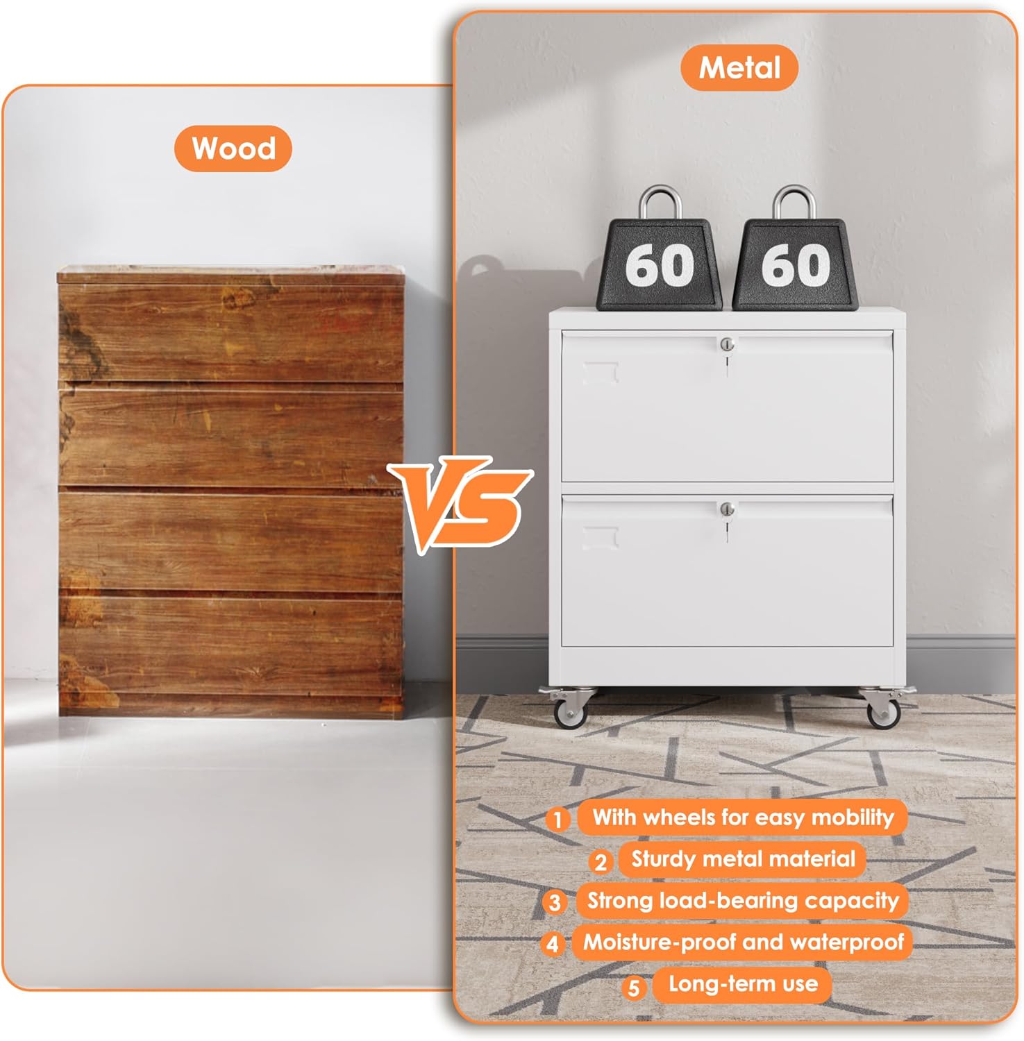 METAN Upgrade 2 Drawers Lateral File Cabinet on Wheels,Steel Office Filing Storage Cabinet with 2 Locks,Assembly Required,White