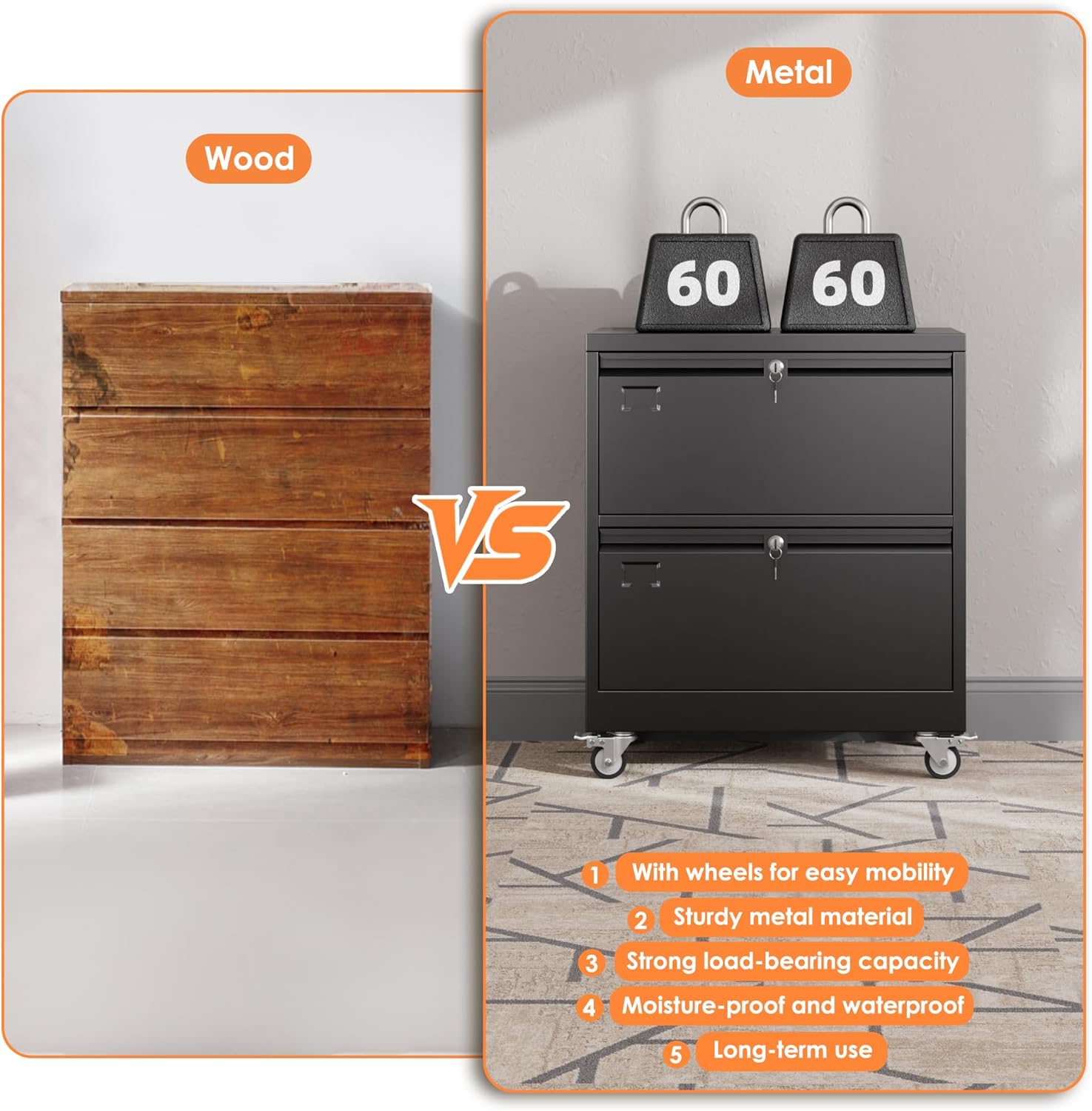 METAN Upgrade 2 Drawers Lateral File Cabinet on Wheels,Steel Office Filing Storage Cabinet with 2 Locks,Assembly Required,Black