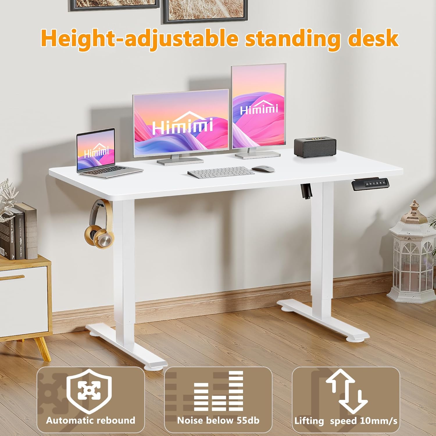 Himimi Electric Standing Desk 55 x 24 inch for Home Office,Sit-Stand Adjustable Desk with Memory Presets,Height Adjustable Desk for Gaming/Working,Free Hook, Lockable Wheels,Mouse Pad,White