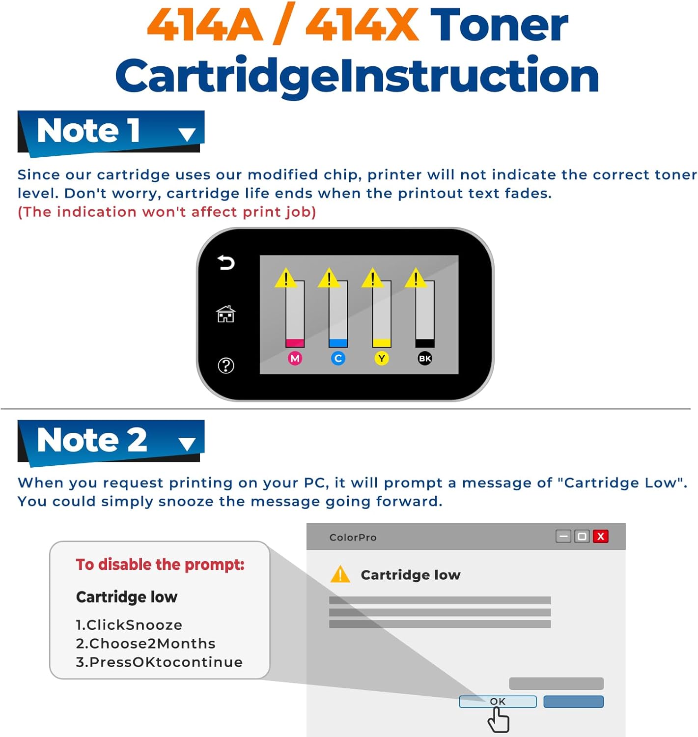 - High Page Yield: Up to 2400 Pages per 414A black toner cartridge, 2100 Pages per 414A Cyan toner cartridge, 414A Magenta toner cartridge, 414A yellow toner cartridge (5% coverage at A4 paper/letter).