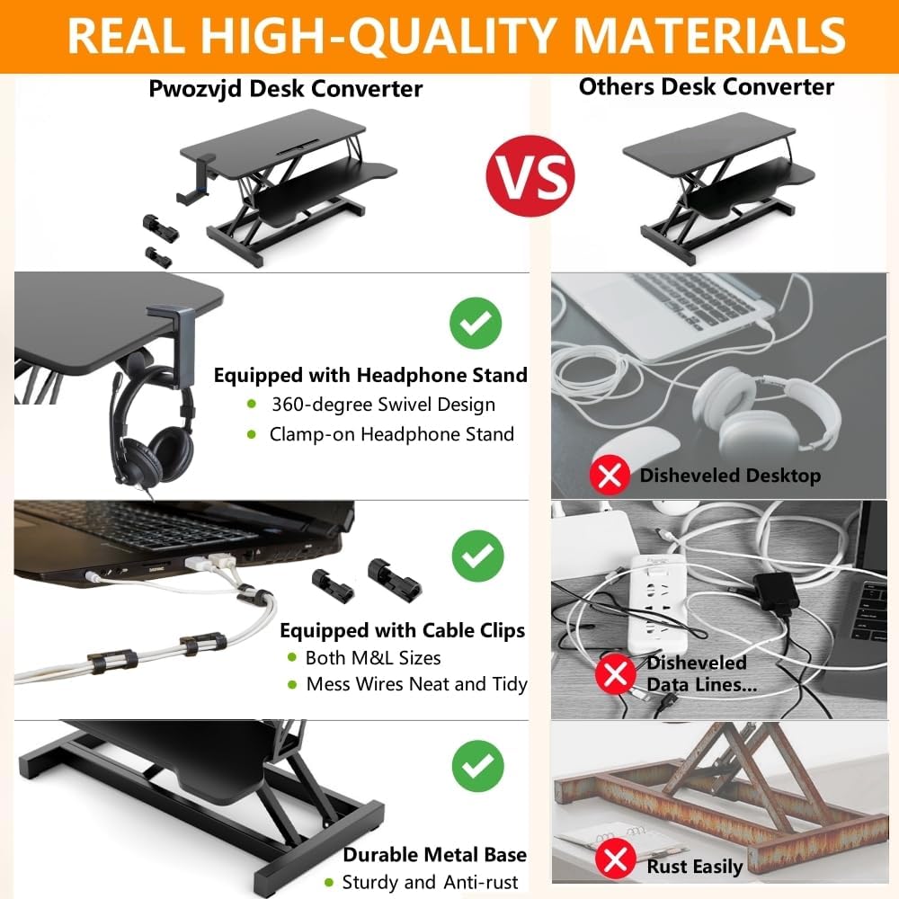 - Easy to Install: Each ergonomic sit to stand desk riser is almost completely assembled. Attach the keyboard tray and headphone stand to use in minutes.Then you will be able to enjoy a comfortable working environment whether you are sitting or standing.