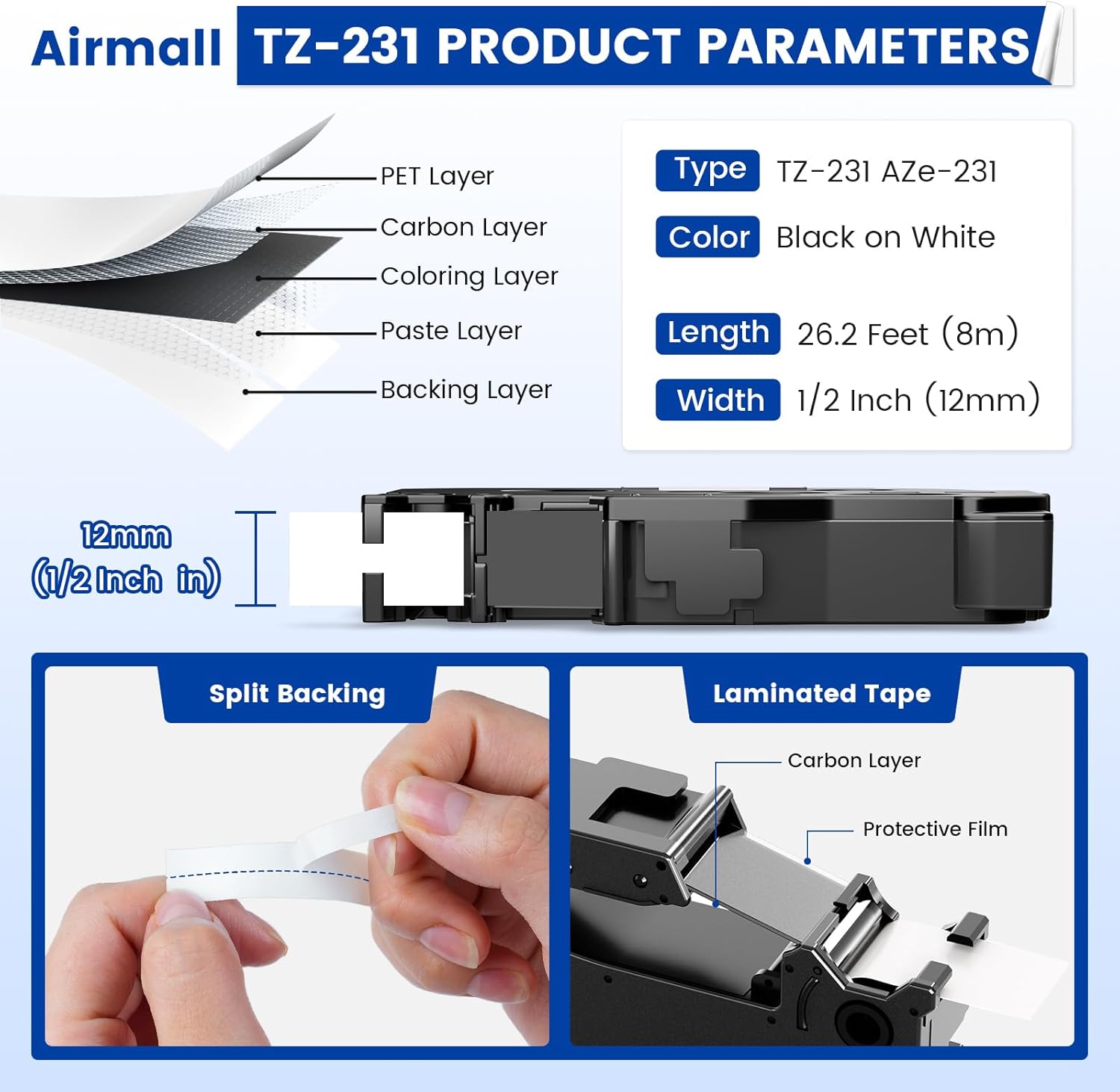 - 【Label Maker Tape Refill Package Includes】Replacement for Brother label maker tape TZe-231 TZ231, TZ231s, TZ-231, TZE231, AZe-231, 1/2”(0.47”) wide x 26.2 ft. (8m) long / Pack, 160m long in toal. Replacement for brother 12mm .47 laminated white tz tape labeling, organizing, and keeping track of your essentials a breeze