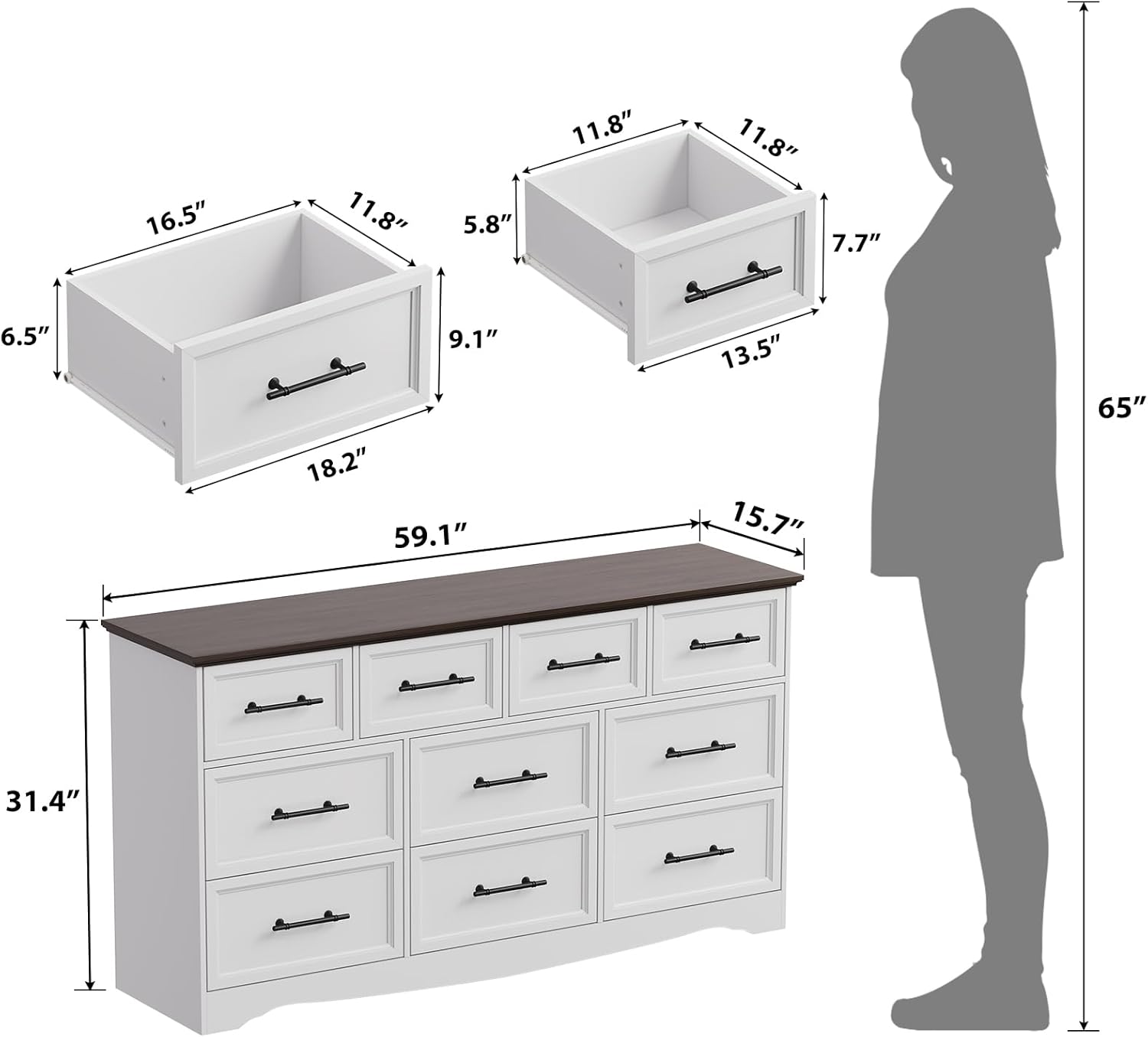 - 【Dimensions】The 10 drawers dresser dimension: 15.7"D x 59.1"W x 31.4"H. Whether in a modern loft or farmhouse setting, this chest of drawers fits right in. It presents a sophisticated interpretation of rustic charm, featuring subtle replicated wood grain with a natural finish for an authentic feel.