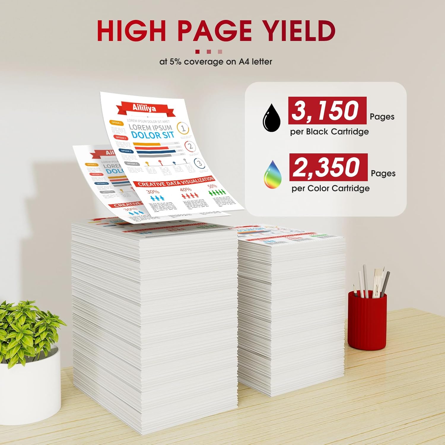 - High Page Yield:3,150 pages per black toner cartridge and 2,350 pages per color toner cartridge at 5% coverage (Letter/A4)