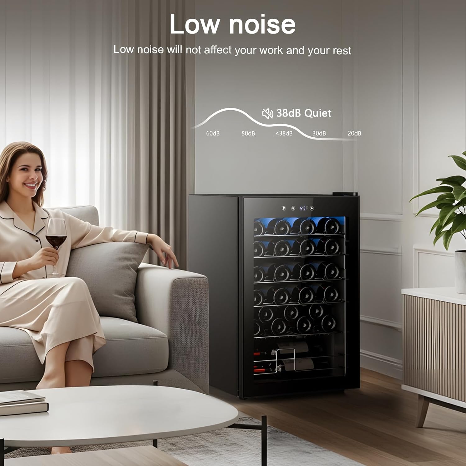- 37 BOTTLE CAPACITY:This wine cooler could hold 37 wine bottles(750ml) of your favorite wine, there is bigger space so that no need to remove any shelf to put different types and sizes of wine. But it only takes D21.85" x W20.28" x H31.5" inches of your space, it can help you save a lot of space. Blue LED lights give you a clearer view of the interior wine. Clear double-layer tempered glass door makes it easy to see your drinks.