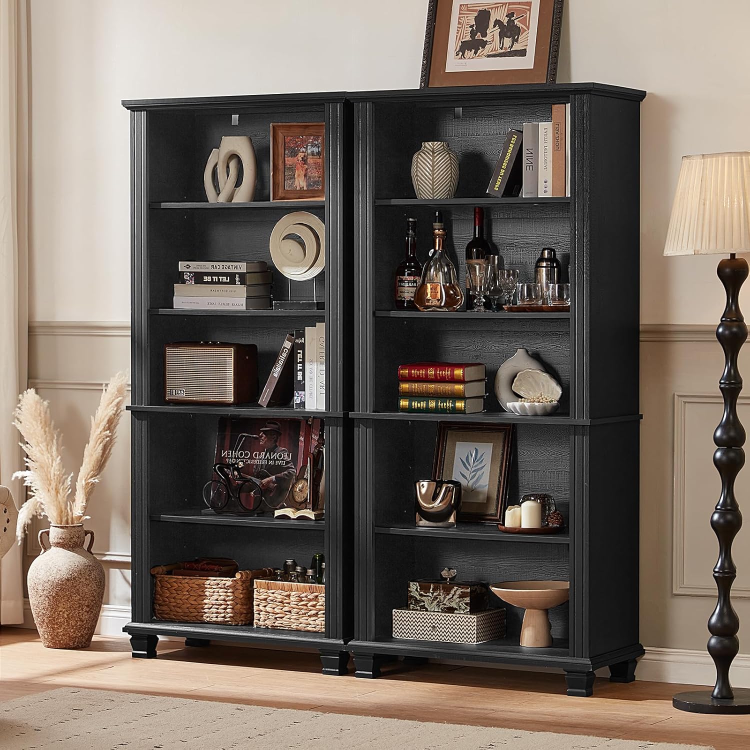 70" Tall Black Bookshelf,5 Tier Wooden Book Shelf with Adjustable Shelves & Wood Legs,Free Standing Farmhouse Bookcase with Open Display Storage,Vintage Bookshelves for Living Room, 2PCS