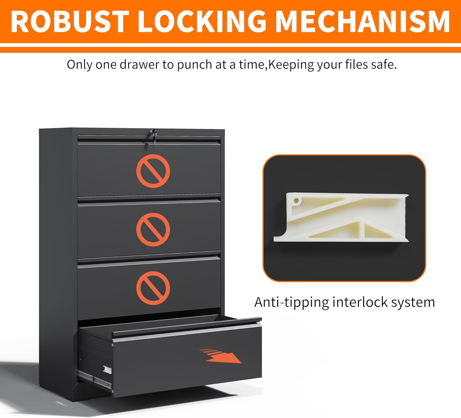 - 【High Security】This office file cabinet ensures high security with 1 interlock and 2 keys, a single lock effectively secures all drawers, allowing you to store valuable documents without any worries. Additionally, the Anti-tilt Mechanism design ensures that only one drawer can be opened at a time, preventing tipping and providing an extra layer of security for your important files.